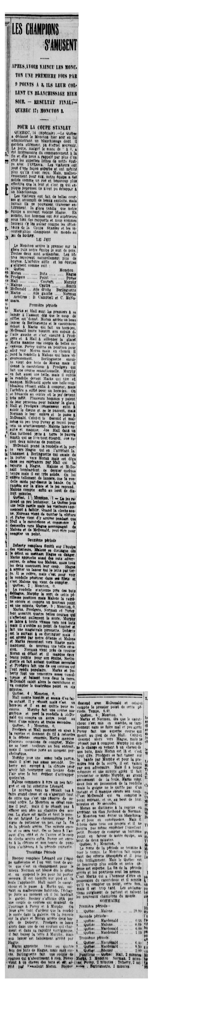La Patrie, un quotidien de Montréal fait grand état de la victoire de 8-0 de Québec sur Moncton. L’équipe remporte donc sa première de 2 Coupes Stanley. L’article est plus complet que celui du Quebec Chronicle. Je vous invite à constater le style très descriptif du journaliste qui, comme c’est l’habitude à cette époque, ne signe pas son texte et ne raconte aucune entrevue.