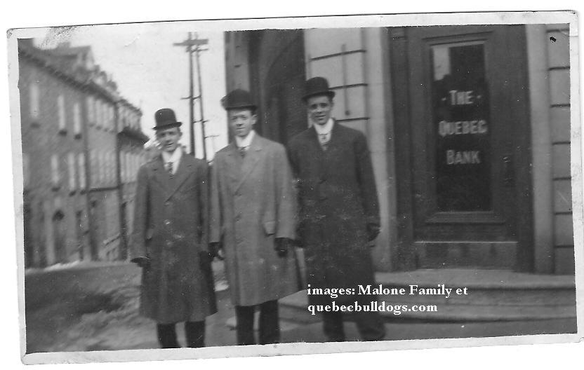 « Season 1911 ». Cette photo des archives de la famille Malone illustre leur célèbre père, Joe à droite, accompagné du joueur étoile de Québec Jack MacDonald au centre et de Jeff Malone, frère de Joe à gauche. Selon la famille, elle aurait été prise à l’automne 1911. Les trois joueurs venaient de quitter la « Quebec Bank« , fiers d’avoir apposé leur nom sur le contrat qui les liait aux Bulldogs de Québec pour la saison à venir.
