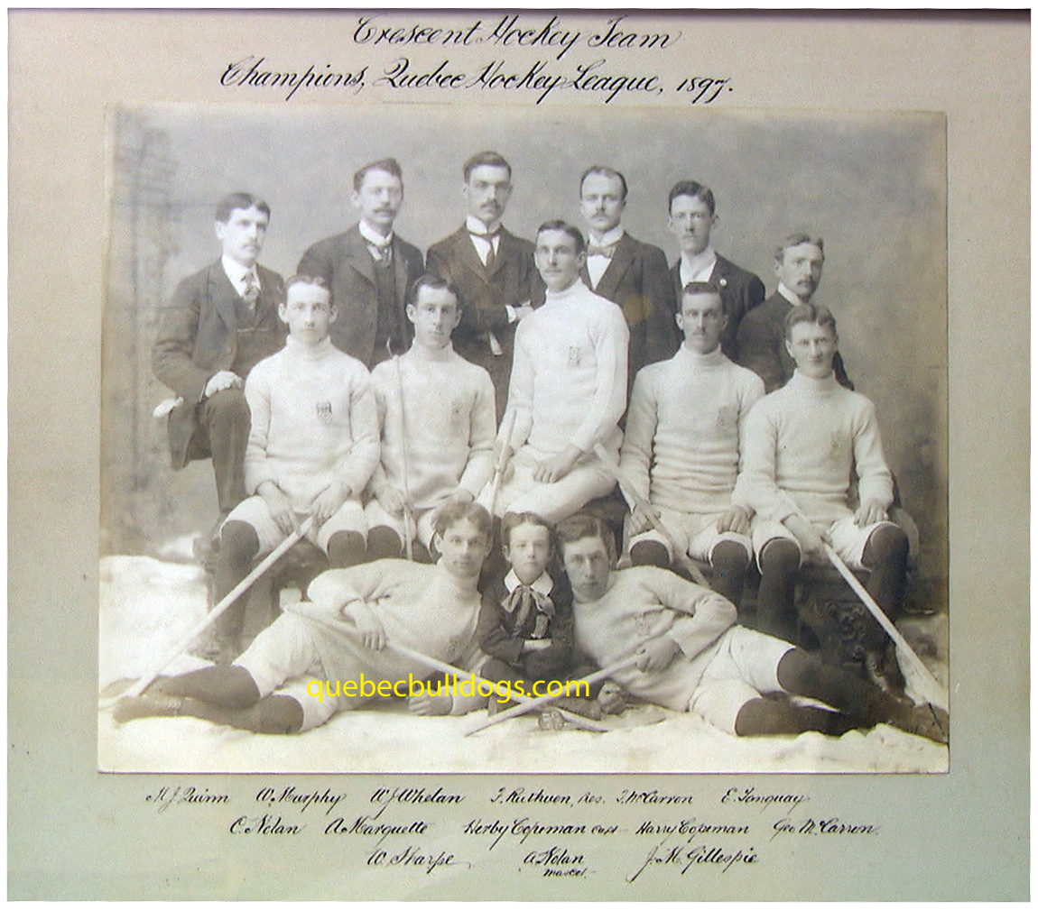 Les dernières apparitions publiques (voir articles précédents) commencent à rapporter. Quelques personnes m’ont contacté pour me faire découvrir leur trésor. Je vous partage ici une magnifique photo des Crescents de Québec, champions de la ligue de hockey de Québec en 1897. Cette équipe allait devenir une des plus populaires de l’époque, avec déjà dans l’équipe, le secrétaire-trésorier M.J. Quinn (premier à gauche, rangée supérieur) et des joueurs tels Chuck Nolan (entraineur des Bulldogs en 1911-1912) et « Jimmy » Gillespie (dernier en bas à droite). Ce dernier, auteur de 36 buts en 36 parties entre 1898 et 1908 avec les Bulldogs est le cousin de la mère de Stuart Wright, le propriétaire de cette photo. Le notaire de Québec a lu l’article concernant mon projet dans le Quebec Chronicle-Telegraph. Il me racontait que sa mère allait régulièrement aux matchs des Bulldogs au Quebec Skating Rink et que son joueur préféré était « Goldie » Prodger, joueur gagnant de la Coupe Stanley en 1912. Merci de partager vos trésors avec nous. Vous pouvez toujours et en tout temps nous en faire part à quebecbulldogs@gmail.com