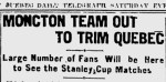 Les 11 et 13 mars 1912, le Québec Skating Club sera bondé. Le hockey prend toute la place dans les journaux anglophones et francophones de Québec. Les Victorias de Moncton sont en ville pour une série de 2 matchs au total des buts. Le 11 mars, Québec suprend les champions de la ligue professionnelle des Maritimes par le pointage de 9-3.