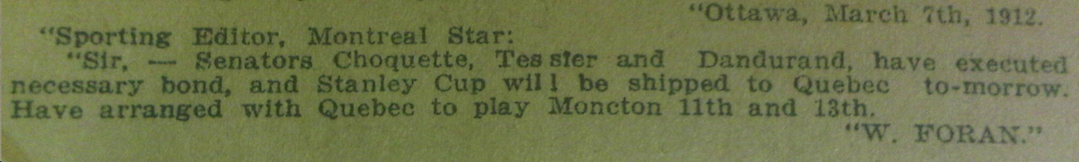 Le lendemain, William Foran, commissaire de la Coupe Stanley autorise le transfert de la Coupe vers Québec et ordonne à ceux-ci de la défendre contre Moncton, les 11 et 13 mars suivants.