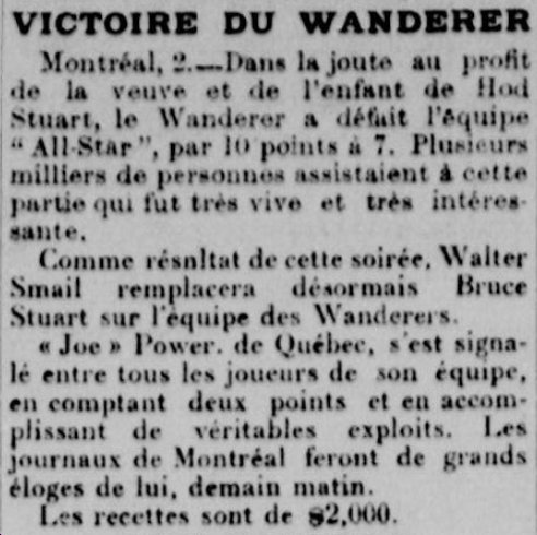 En décembre 1907, les Wanderers proposent de jouer un match dont les profits viendront soulager financièrement la famille. Le 2 janvier 1908, 3800 spectateurs assistent au « Hod Stuart Memorial Game », une partie qui oppose les champions de la Coupe Stanley à un groupe des meilleurs joueurs des autres équipes de la E.C.A.H.A.. Au moins un joueur des 5 équipes composent cette formation, comme le veut la coutume aujourd’hui. 3 joueurs de Québec y prennent part : le gardien du Ottawa Percy Lesueur et les joueurs Ed Hogan et Joe Power du Club de Hockey Québec. Tous ont joué en sa compagnie lors de son passage fort apprécié à Québec. Les Wanderers l’emportent 10-7; Joe Power compte 2 des buts des « All-Stars».