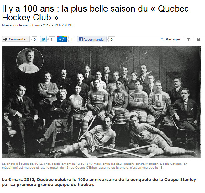 La saison 1912, c’est celle où le hockey se joue maintenant à 6 joueurs de chaque côté, c’est aussi l’arrivée des numéros sur les chandails… et celle d’une première coupe Stanley pour le vieux Club de hockey Québec. Voyez le reportage ici, diffusé à Radio-Canada, mardi le 6 mars 2012.