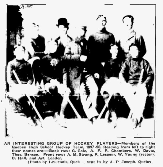 Je suis tombé par hasard sur cette photo dans le Montreal Standard de 1908. Une image d’une équipe de hockey du Quebec High School. Elle est pauvre en qualité, mais riche en information. On y aperçoit Percy Lesueur, futur gardien étoile des Sénateurs d’Ottawa et membre du Temple de la renommée ainsi que d’éventuels joueurs du Club Québec: le défenseur étoile Art Leader qui porte les jambières et Bryan Hall. George Gale est le frère aîné d’Alfred qui joué pour Québec et Westmount chez les seniors. Enfin, Thomas Benson a joué pour le Quebec II, filiale du club senior dans la ligue intermédiaire et a joué trois matchs avec les Victorias de Montréal de la CAHL.