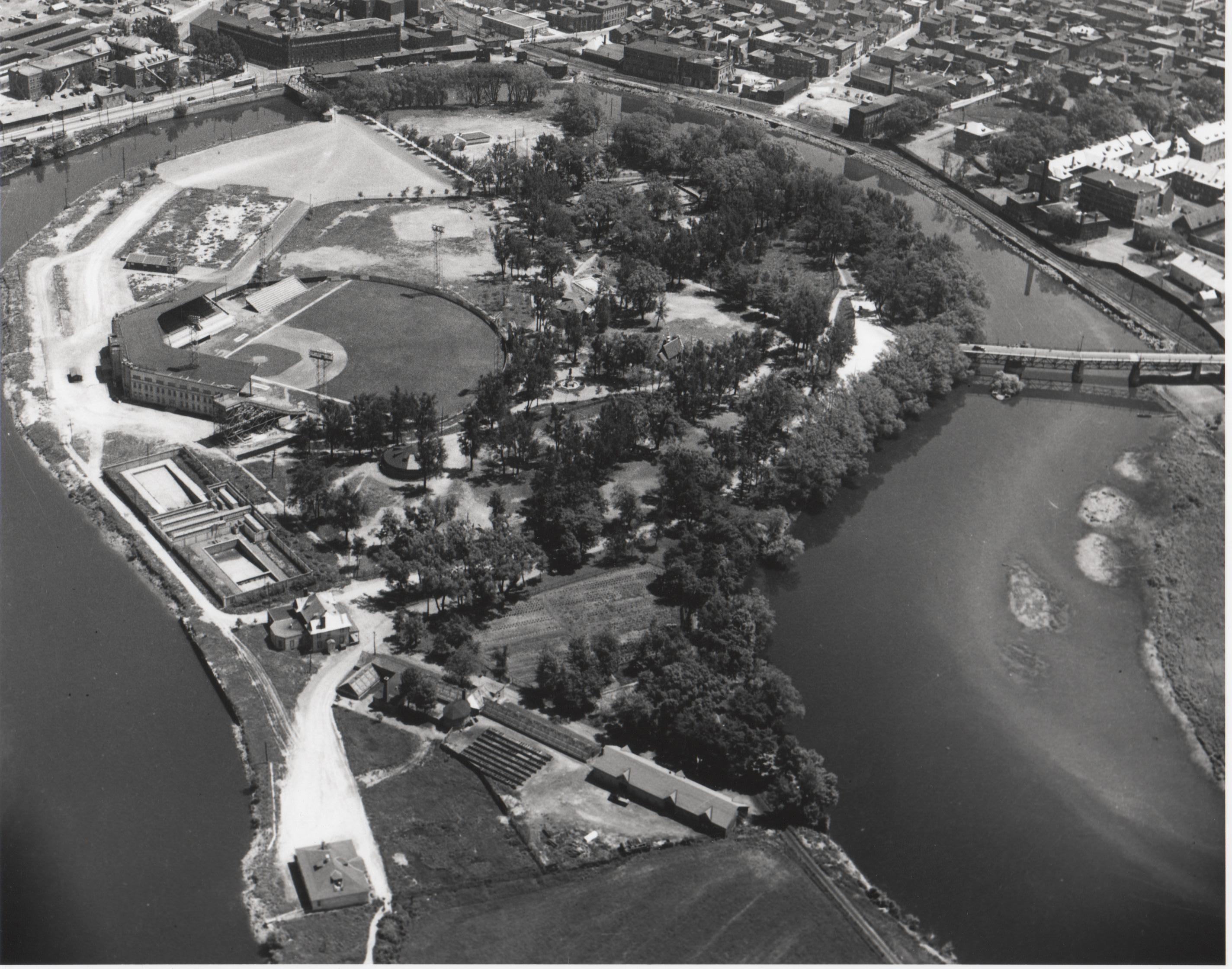 Vue aérienne du Parc Victoria qui a bien changé depuis: Jadis une presqu’ile, avec deux piscines, etc… Ce cliché datant de 1946 nous montre très clairement l’emplacement de l’Aréna de Québec construit suite aux deux conquêtes de la coupe Stanley en 1913. Il était là, sur le rectangle tout juste à gauche du Stade municipal. Il a été victime des flammes en 1942. Cliquez deux fois sur la photo pour une meilleure résolution.