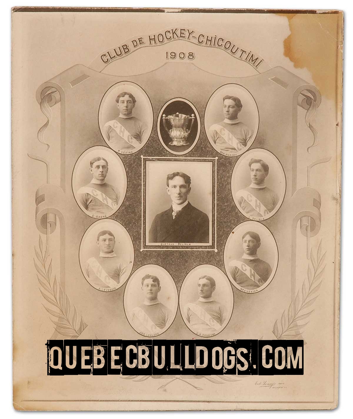 Le Club de hockey Chicoutimi, 1908. Cette équipe qui challenge régulièrement les meilleurs clubs au Québec compte sur le gardien George Vézina (1887-1926) (à la position 4 sur une horloge). On le dit déjà exceptionnel, mais il accorde 34 buts pour trois défaites en quatre parties répertoriées contre les clubs de l’Université Laval et Québec entre 1905 et 1909. Il impressionne toutefois les gens du Canadien en 1910, assez pour le mettre sous contrat pour la saison 1910-11.