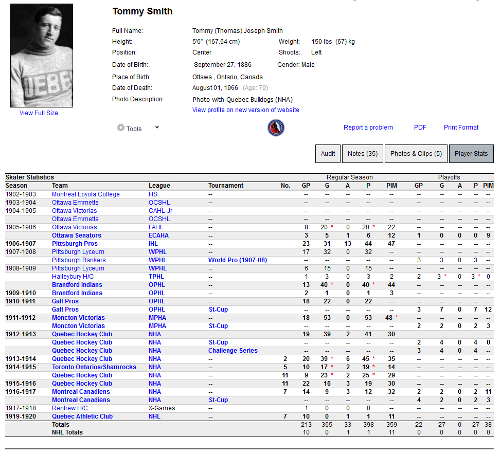 Détenteur du record de buts dans un match régulier des ligues majeures professionnelles de hockey – 9 avec les Bulldogs en janvier 1914 – il aura été champion compteur de la NHA à deux reprises, puis capitaine du Club de hockey Québec.