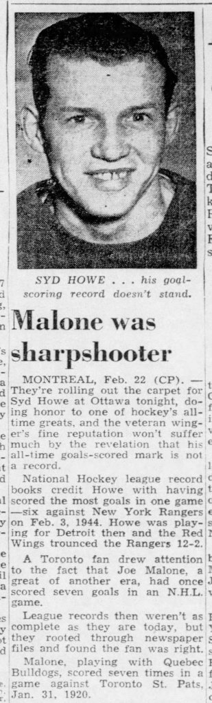 Alors qu’à Ottawa, on déroule le tapis rouge sous les pieds de Howe pour un hommage trois ans plus tard, le 22 février 1947, un amateur averti de Toronto souligne dans certains journaux que le record appartient en fait à Joe Malone. Malgré cet article, seule l’intronisation de Malone au Temple de la renommée en 1950 semble secouée la LNH, et l’Ottawa Citizen n’hésite plus à remettre en question la marque de Howe. Les années ont semblé tranquillement corriger la faute. Lorsque Red Berenson compte six buts en 1968 pour les Blues de St-Louis, la presse souligne que le joueur des Blues a égalé le « record moderne ». Ce terme, n’est plus utilisé aujourd’hui, pas plus le 7 février 1976 lorsque Darryl Sittler devient le dernier joueur à être passé si près…