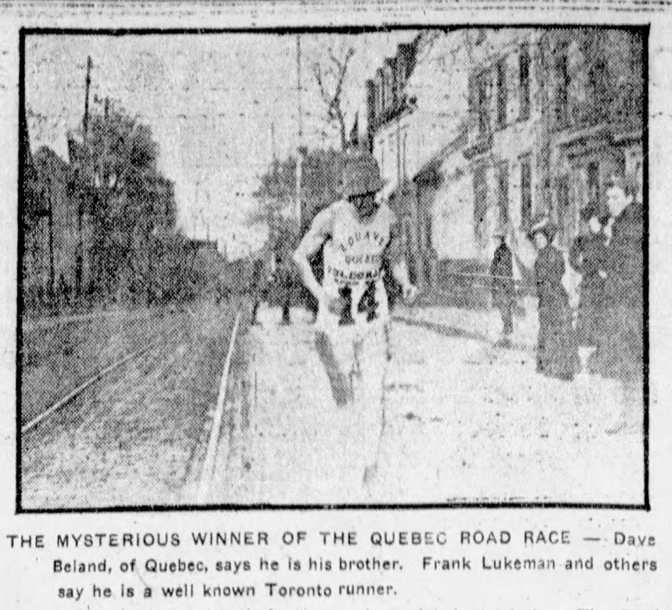 Le retour au pays est marqué par un épisode rocambolesque qui témoigne de l’audace, voire de l’insolence de Béland. Le 31 octobre 1908, lors d’une course de 5 miles organisée par le Quebec Telegraph, un inconnu inscrit sous le nom de «Walter Béland» — prétendument le frère de Dave — écrase la compétition et disparaît sans réclamer son prix.